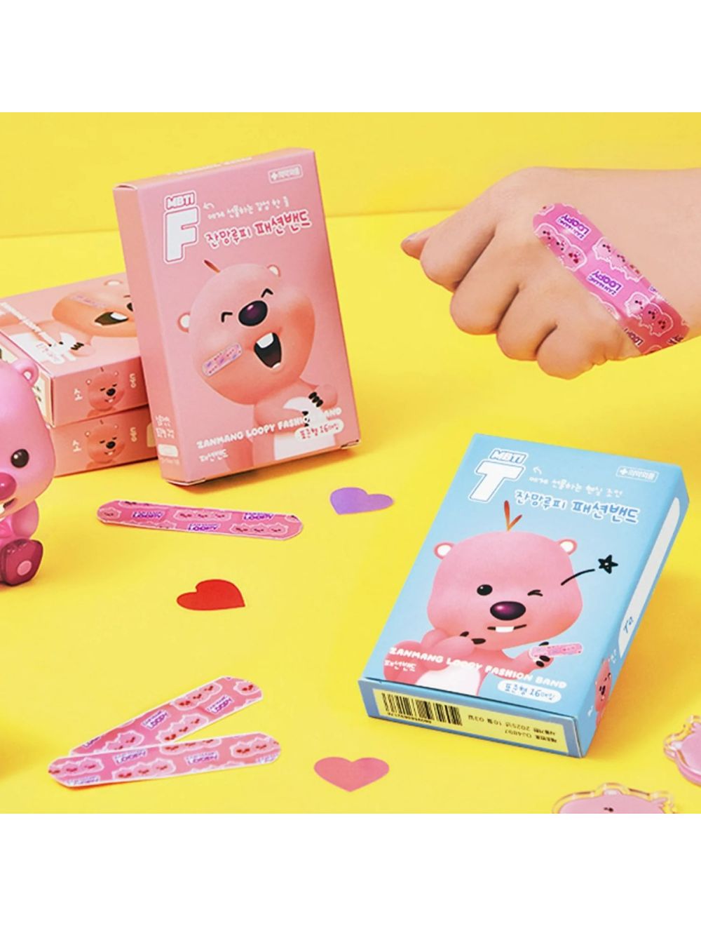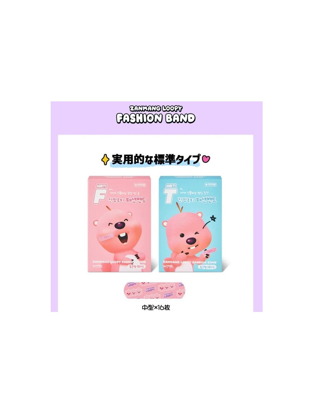 The ZANMANG LOOPY Fashion Bandages are a set of 16 adhesive bandages featuring designs inspired by the character Loopy from the Zanmang Loopy series. These bandages are available in pink and blue colors and are intended to add a playful touch to minor wound care.